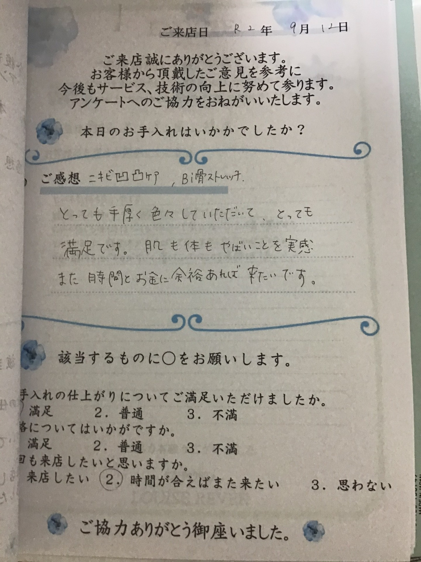 ほんの一部になりますが、お客様よりいただいたうれしいお声をはげみにスタッフ一同より一層よりよいサロンを目指して頑張っていきますのでよろしくお願いいたします。