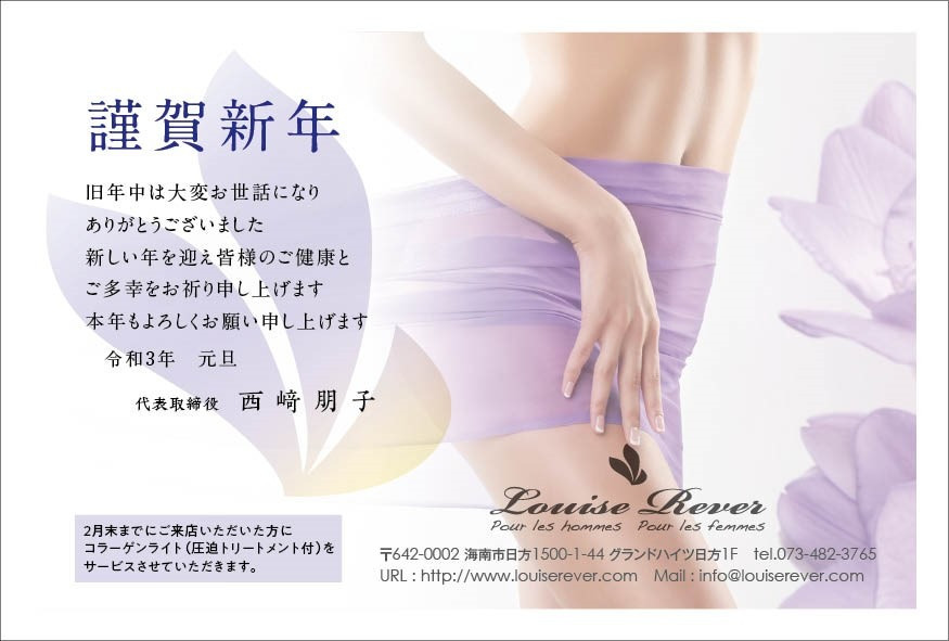年賀状をお持ちいただくと、当店人気メニューのコラーゲンライト(圧迫トリートメント付)がなんと、サービスでお受けいただけますのでぜひご活用下さい。
