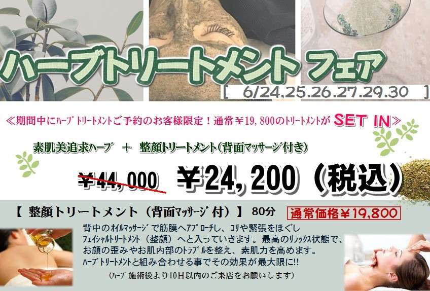 この期間中にハーブトリートメントをお受けいただいた方には、なんと!!通常 ¥19,800の整顔トリートメントが無料!!でお受けいただける