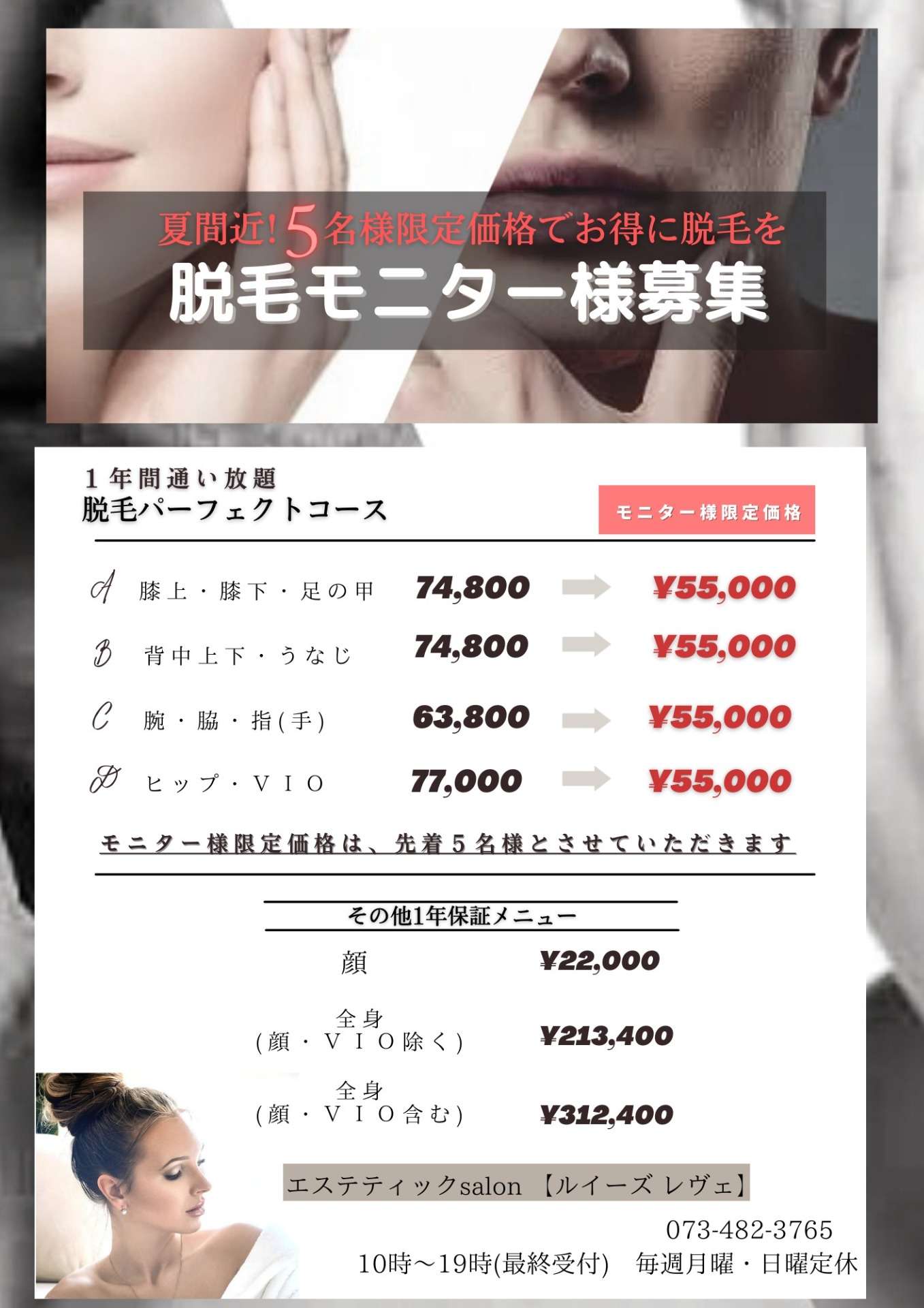 脱毛はモニター撮りをさせていただく為、限定5名様とさせていただきます。