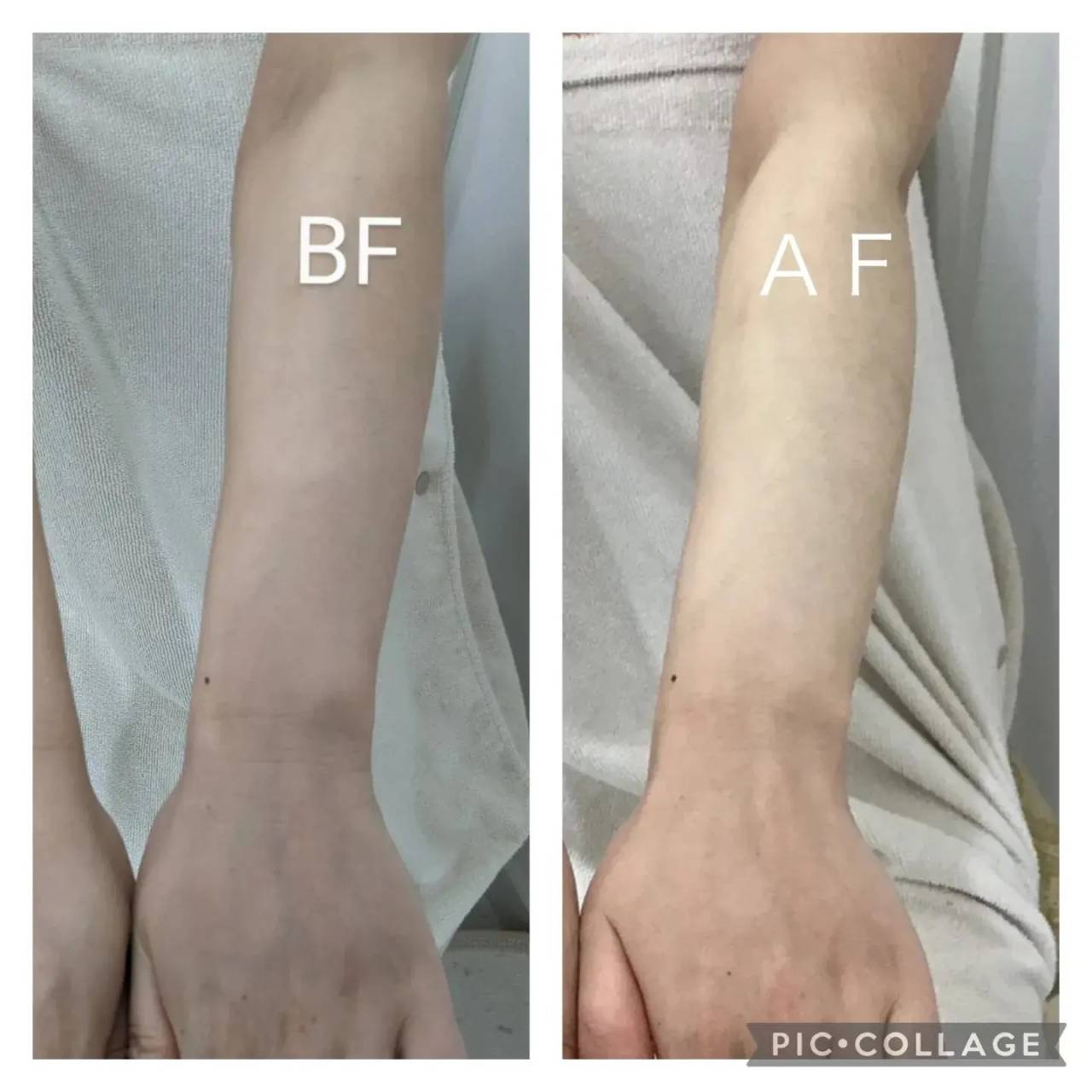 写真でもお分かりいただけるかと思いますが、泡をのせて3分ほど置いておいただけでこんなにも肌色がちがうんですよ!!